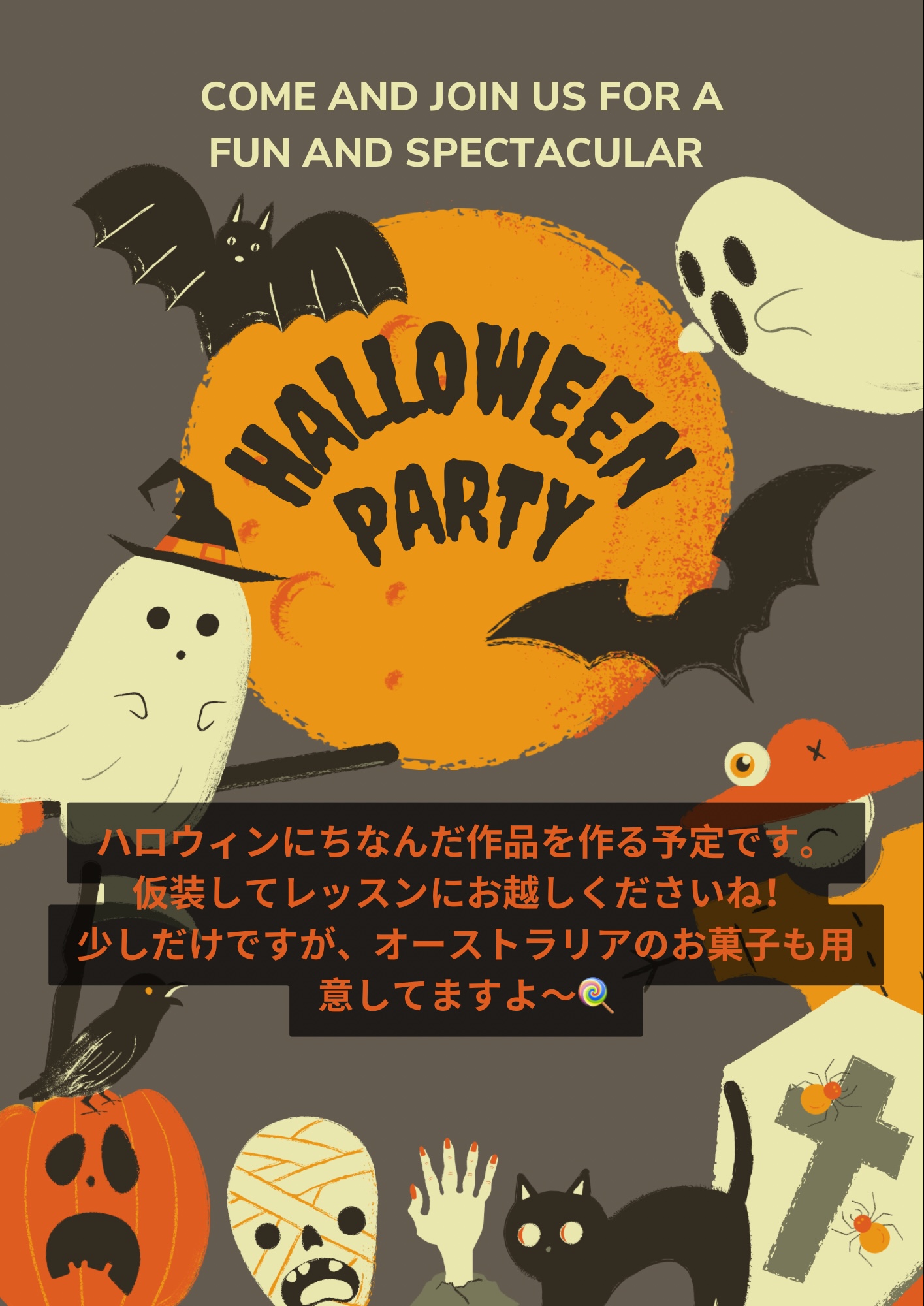 🎃ハロウィンレッスンのお知らせ🎃 いつもお世話になっております。今年もハロウィンの時季になりましたね。今年は、10/28火曜日と10/31金曜日にハロウィンレッスンを開催します。※11/1土曜日のレッスンはありませんので、土曜日レッスンの方は上記のどちらかのレッスンにご参加ください。時間は両日17:00〜18:30の1時間半で、パーティ途中での退室や、遅れて参加なども大丈夫です🙆♀️当日は、ハロウィンにちなんだレッスンをします。少しだけですが、オーストラリアのロリー(お菓子)も用意しています🍭ハロウィンレッスンなので、みなさん仮装してお越しくださいね👻 ご不明な点やご質問等ありましたらお気軽にご連絡ください。宜しくお願いします🤲